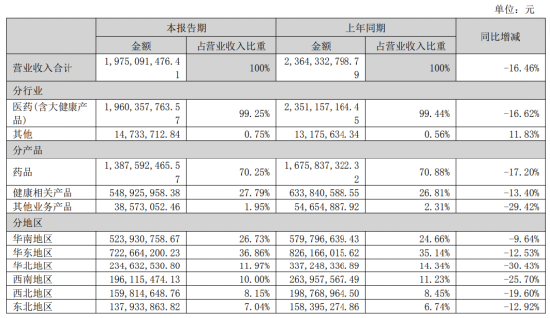 具体到产品,半年报中,仁和药业三大支柱均双位数下降。其中,药品营收降为13.88亿元,同比下滑17.2%;健康相关产品营收降为5.49亿元,同比下滑13.4%;其他业务产品营收降为0.39亿元,同比下滑29.42%。