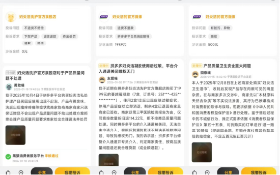 还有消费者亦表示:“购买的凝胶使用后出现了皮肤过敏症状,停用产品症状立即消退”“卫生湿巾存在肉眼可见的明显杂质,商家却以木材天然含杂质为由推诿扯皮”“私处护理产品有腥臭味,使用后出现瘙痒疼痛等症状“。